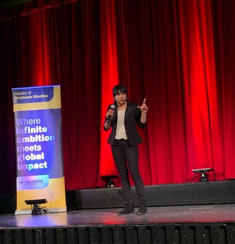 Nuwanthi Samarasinghe recently participated in the 3MT (three-minute thesis) event at Dalhousie. Graduate students distilled the background, goals, and findings of their research into a three minute presentation with one slide targetted at a general audience. Students first competed in heats and Nuwanthi was one of eleven students selected for the final competition held this week at Dalhousie.